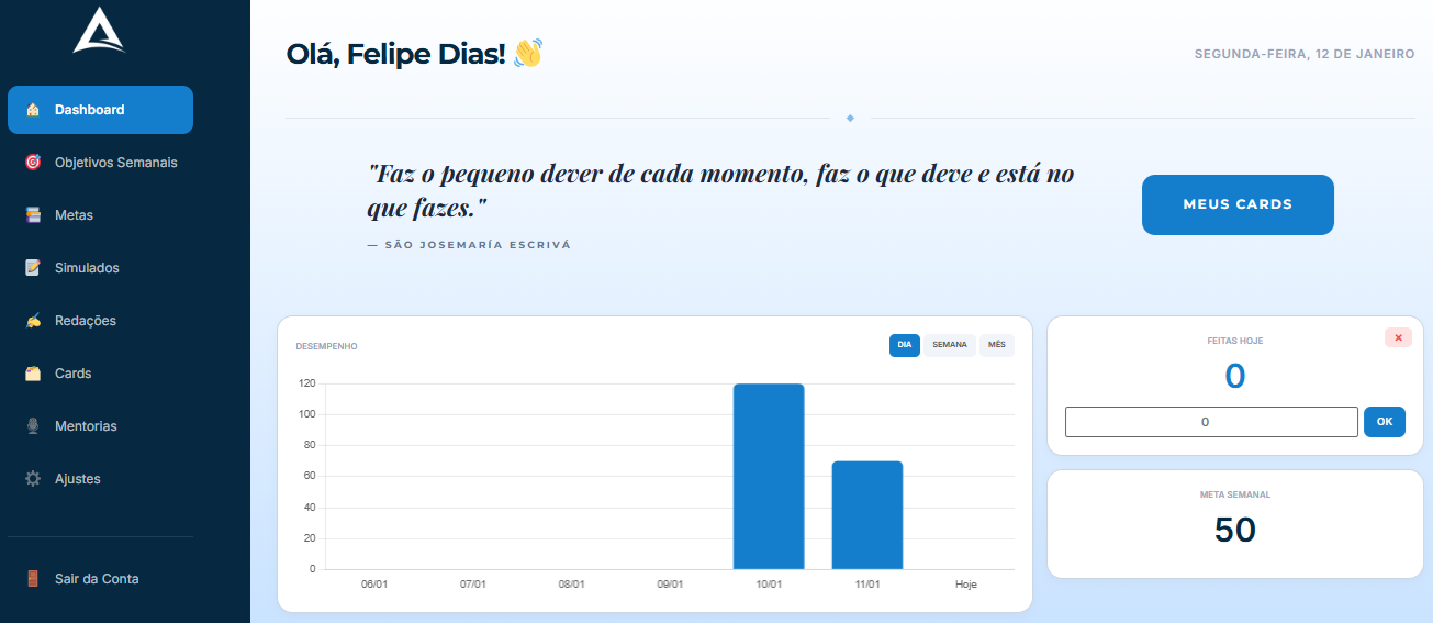 Nossa missão é converter dedicação em resultados através de um método que une planejamento inteligente e suporte personalizado, garantindo que cada aluno trilhe o caminho mais eficiente rumo à excelência.